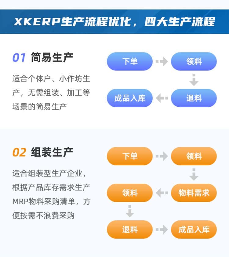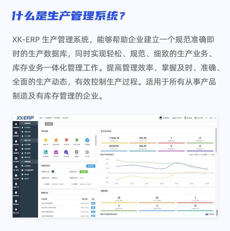 XK-ERP生产管理系统,能够帮助企业建立一个规范准确即时的生产数据库,同时实现轻松、规范、细致的生产业务库存业务一体化管理工作。提高管理效率、掌握及时、准确全面的生产动态,有效控制生产过程。适用于所有从事产品制造及有库存管理的企业。